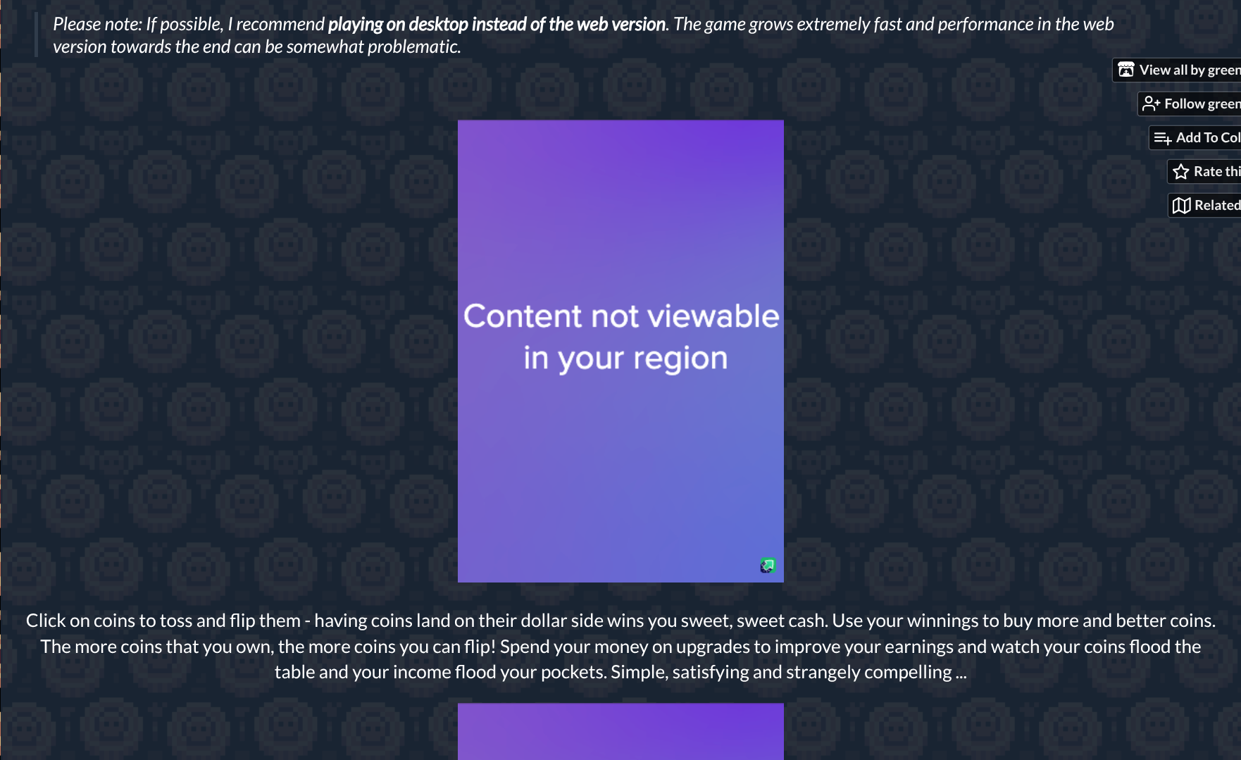 Click on coins to toss and flip them - having coins land on their dollar side wins you sweet, sweet cash. Use your winnings to buy more and better coins. The more coins that you own, the more coins you can flip! Spend your money on upgrades to improve your earnings and watch your coins flood the table and your income flood your pockets. Simple, satisfying and strangely compelling ...